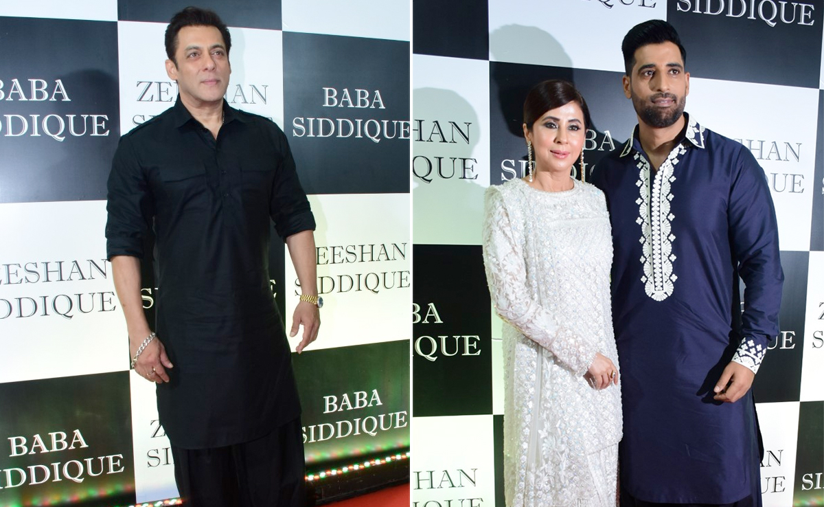 Salman Khan looked dapper in a black pathani suit and happily posed with Baba Siddique and his son Zeeshan. Salim Khan was also pictured with the father-son duo.