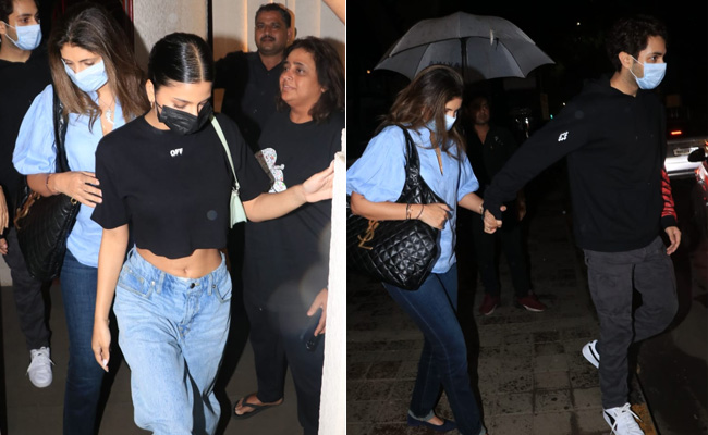 Shah Rukh Khan's daughter Suhana Khan and Amitabh Bachchan's grandson Agastya Nanda, who will be soon making their big Bollywood debut with The Archies, were pictured in Mumbai with Shweta Bachchan (Agastya's mom) on Tuesday. They were snapped outside a restaurant in the city along with Shweta Bachchan's friend Kaajal Anand. Suhana Khan looked pretty in a black crop top teamed with jeans and sneakers. She tied her hair into a neat bun and sported a black mask. On the other hand, her co-star Agastya looked uber cool in a black hoodie and grey pants. Shweta was seen in a blue shirt paired with dark blue jeans.