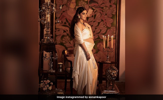 Sonam Kapoor is radiating pregnancy glow in the latest photos. Last night, she attended designer Abu Jani's birthday eve and for the occasion, she wore a white satin saree from the designer duo Abu Jani and Sandeep Khosla. She styled her saree with her mother Sunita Kapoor's statement jewellery and looked gorgeous. She completed the look with matching juttis and a strapless blouse. In the photos shared online, Sonam Kapoor is seen showing her baby bump. With dark kohled eyes, nude lips, and center-parted hair, Sonam is a sight to behold! She captioned the photos as "Last night for my @abujani1 birthday evening. In @abujanisandeepkhosla and @kapoor.sunita." Sonam was designed by her sister and filmmaker Rhea Kapoor.
