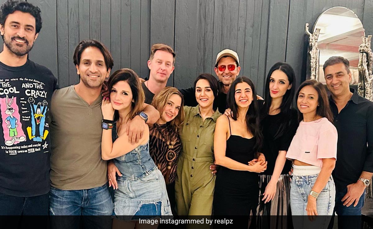 Actress Preity Zinta never loses an opportunity to catch up with her friends in India. The actress and her husband Gene Goodenough are settled in Los Angeles with their twins. The actress, who is in Mumbai, has shared a photo of her most recent rendezvous with her group of friends, which includes Hrithik Roshan and his girlfriend Saba Azad, Sussanne Khan – who was previously married to Hrithik – and boyfriend Arslan Goni, and Kunal Kapoor, along with Gene. In the post, she added a geotag for Mumbai and wrote in the caption, “Friday night fever with these mad hatters [heart and heart-eye emojis] #friendslikefamily #nightout #aboutlastnight #ting.” In response, Sussanne wrote, “Love you, Pree.”