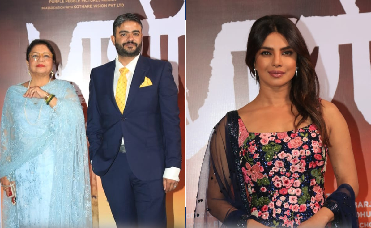 Priyanka Chopra had a busy schedule in India. After attending brother Siddharth's registry ceremony and wedding festivities, the Dostana actor checked into the screening of her Marathi production Paani on Monday night in Mumbai. She was accompanied by mother Madhu Chopra and brother Siddharth at the event. Priyanka Chopra looked a true-blue desi girl as she chose a blue salwar suit for the occasion. She kept her tresses loose and accessories minimal. Priyanka Chopra flashed her bright smile for the cameras on the red carpet. Take a look at the pictures here: