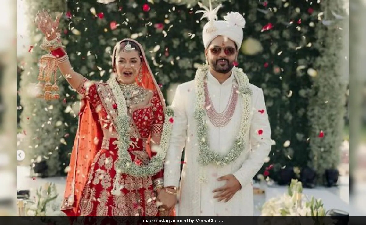 Priyanka Chopra's cousin Meera Chopra married businessman Rakshit Kejriwal in the presence of family and friends today in Jaipur. The new bride shared pictures from the ceremony on her Instagram feed. In the pictures shared, Meera and Rakshit can be seen posing happily for the cameras. In one picture, we can see flower petals being showered on the newlyweds. There are a few images from the varmala ceremony as well. In another click, the happy bride can be seen laughing her heart out. Sharing the pictures, Meera wrote, "Forever now in happiness, fights, laughter, tears and lifetime of memories. Har Janam Tere Sath." She added the hashtag #Mera. Actor Barkha Sengupta wrote, Congratulations girl .... Wishing both of u love and happiness @meerachopra." Take a look: