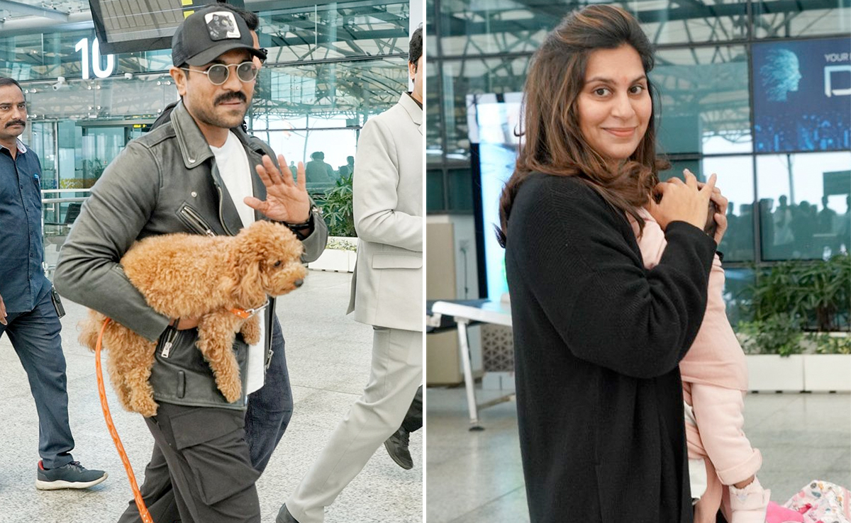 Ram Charan and Upasana are in holiday mood. The couple were pictured at the Hyderabad airport. The couple flew to Italy along with their daughter Klin Kaara and their pet pooch Rhyme. Both Ram Charan and Upasana were all smiles as they were clicked at the airport. Ram Charan has had a stellar year, professionally as well as personally. He attended the Golden Globes and the Oscars this year, where the song Naatu Naatu from his film RRR won the Best Original Song. The actor also welcomed a daughter with wife Upasana this year.