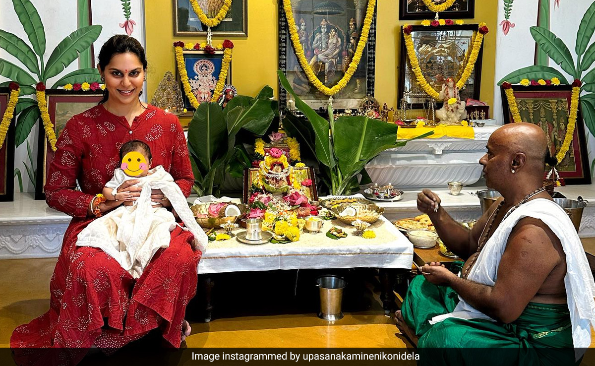 Upasana Kamineni Konidela shared an adorable picture with her daughter Klin Kaara from the Varalakshmi Vratham puja. The photograph features Upasana sitting, surrounded by idols, with her daughter Klin Kaara on her lap. Upasana covered the face of the baby with an emoji. Upasana's husband, actor Ram Charan, who missed the Varalakshmi puja, has now reacted to the pic. Ram Charan posted Upasana's snap on Stories with a short message: “Missed being there … [red heart] but nice emoji Upasana Kamineni Konidela [wink and love-filled emoji].” Re-sharing her husband's shout-out, Upasana simply added a “We love you” gif. Ram Charan and Upasana welcomed their first child, a daughter, on June 20 this year.