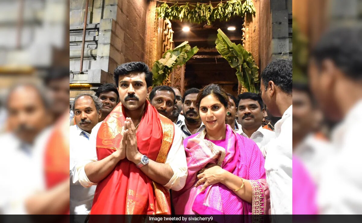 Ram Charan, who celebrates his 39th birthday today, paid a visit to Tirumala temple with wife Upasana and daughter Klin Kaara to seek blessings. Photos and videos from the temple venue are already viral. In the pictures, Ram Charan can be seen greeting the shutterbugs with folded hands. He can be seen wearing the traditional vesthi. Upasana can be seen wearing a pink saree. She can be seen guarding their daughter Klin Kaara from the glares of media. Sharing the pictures on X (formerly known as Twitter), a fan page dedicated to the actor wrote, "Finishing the vows on a special day.Global Star @AlwaysRamCharan and @upasanakonidela were spotted offering prayers at Tirumala on the occasion of the Ramcharan's birthday today." Take a look: