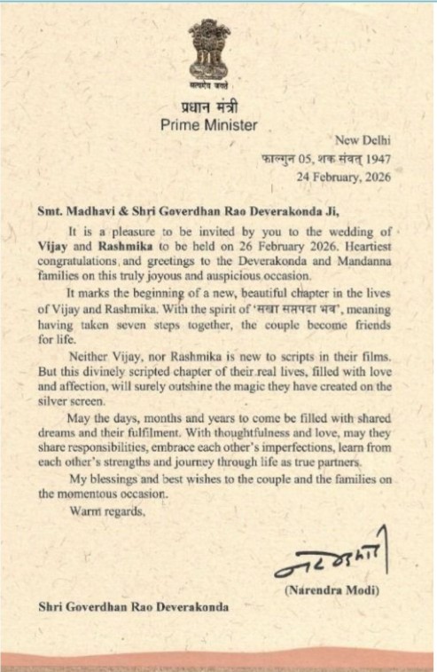 Prime Minister Narendra Modi was invited to Rashmika Mandanna and Vijay Deverakonda's wedding today. The Prime Minister, who is currently in Israel for a two-day state visit, sent a letter to Vijay Deverakonda's parents congratulating the family on the auspicious occasion. Read the full story here.