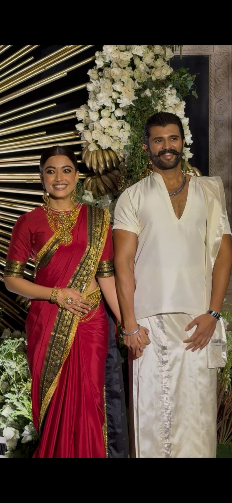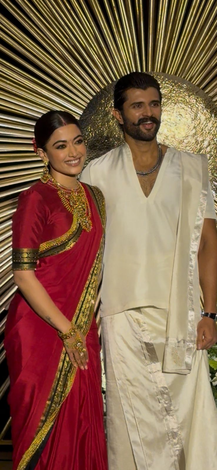 The newlyweds dressed in Indian traditional wear - Rashmika in a red Mysore silk saree and Vijay in an ivory veshti-shirt set. However, their gold jewellery by SHREE Jewellers stole the spotlight. Read on