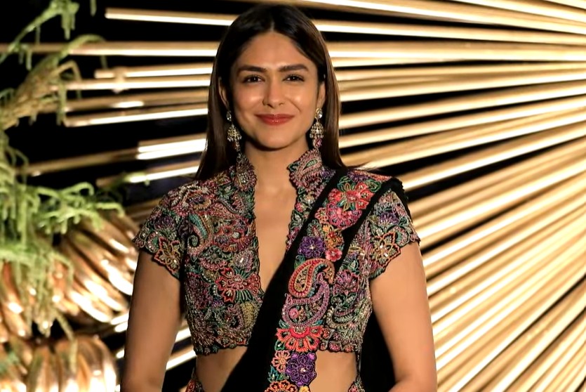 Mrunal Thakur arrives in black saree for the exclusive event.