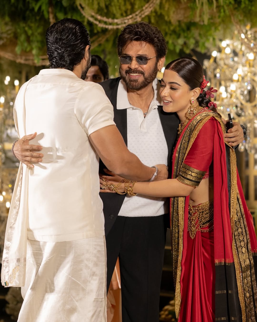 Here, Venkatesh can be seen hugging the newlyweds.