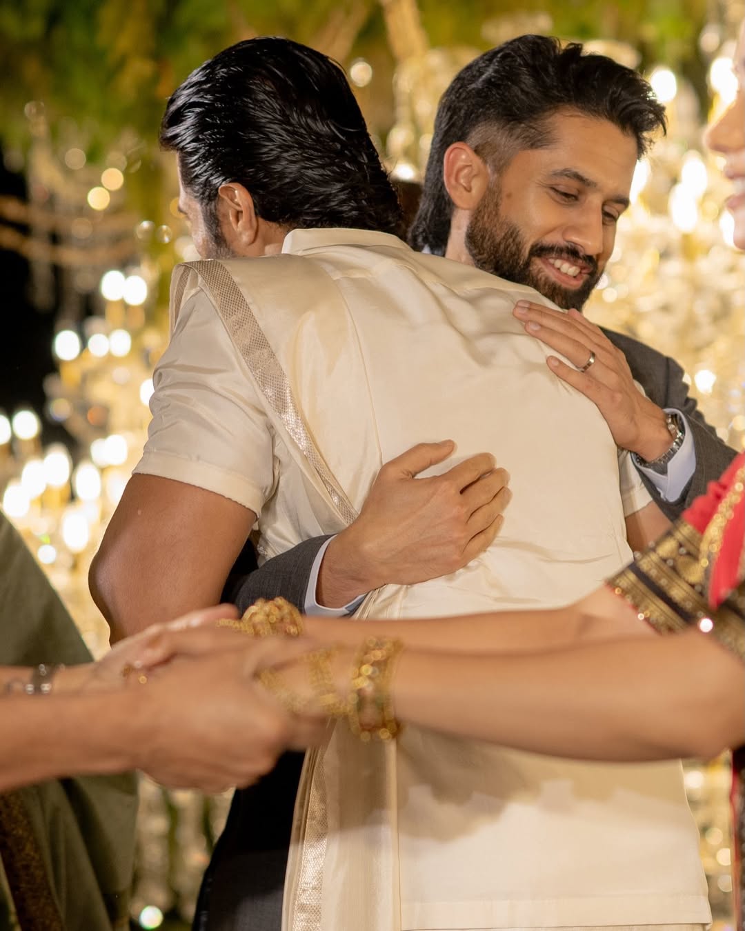 Naga Chaitanya and Vijay Deverakonda can be seen sharing a hug.