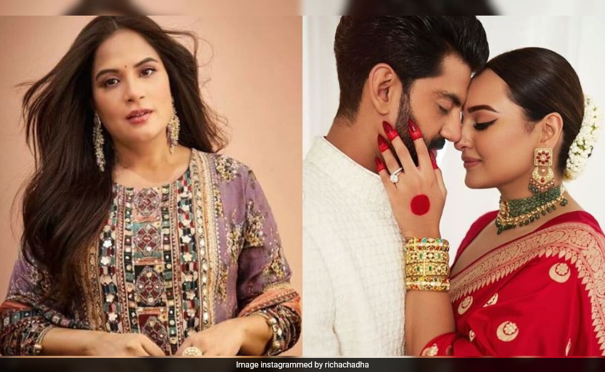 Sonakshi Sinha and Zaheer Iqbal got married in a civil ceremony on June 23. The actress' close friend and Heeramandi co-star Richa Chadha, who attended the couple's reception in Mumbai, recently sent her best wishes to the couple. She also reacted to Sonakshi and Zaheer being trolled for their interfaith marriage. Richa shared a photo of the newlyweds on her Instagram stories and wrote, "Dear Sona and Zaheer! I am floored by your simplicity, your commitment to each other and am so damn happy that you dance to your own tune! Didn't get a photo with you because you were swamped, but Ali and I love your spirit!”