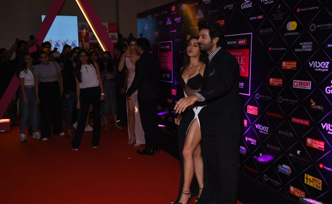 On the red carpet at an award ceremony on Thursday, Sara Ali Khan and Kartik Aaryan had a mini reunion. The duo, who worked together in Imtiaz Ali's Love Aaj Kal, were seen exchanging pleasantries and then soon, posed for a stylish picture, later joined by Varun Dhawan and Kriti Sanon. Varun Dhawan and Kriti Sanon posed stylishly with Sara and Kartik, whose red-carpet moment became the talk of the town, it seemed. For the style awards, Sara turned heads in a gorgeous monochromatic gown with a thigh-high slit and a sheer corset look. Kartik looked dapper in a check shirt with black suit and tie.