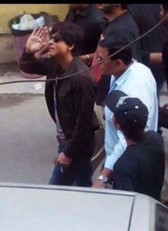 SRK, who has a double role in the film, was spotted waving at his fans as he arrived to shoot for Fan in the suburb of Rohini. He will be seen playing the fan of a superstar in the film.