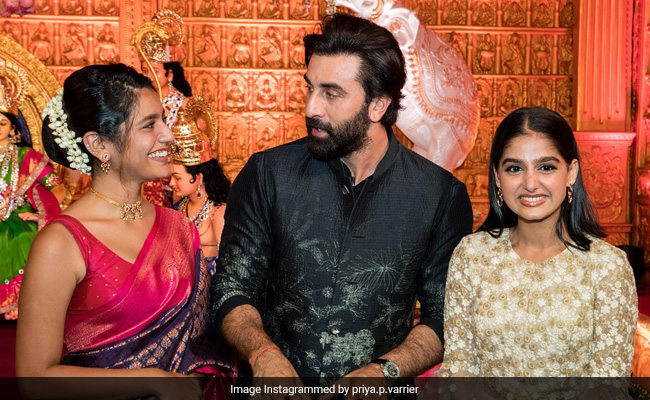 South star Priya Prakash Varrier has shared a set of pictures from a Navratri function hosted by the Kalyanaraman family in Kerala. During the festivities, the actress met some renowned actors, including Ranbir Kapoor, Prithviraj Sukumaran and Jayasurya Jayan. Priya Varrier was quite happy at the event and her “smile says it all”. In the first slide, Priya Varrier is seen smiling ear-to-ear with Ranbir Kapoor and actress Anaswara Rajan. She looks gorgeous in a navy-blue saree with a pink border. The next one shows Priya Varrier sharing the frame with Prithviraj Sukumaran. The actress is seen laughing with all her heart in this pic featuring The Family Man actor Neeraj Madhav, actor-filmmaker Nivin Pauly and Malayalam actress Aparna Balamurali.