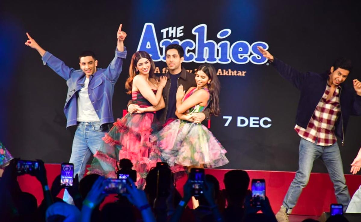 Zoya Akhtar's much-awaited film The Archies is just a few days away from its digital release on the streaming platform Netflix. Ahead of it, the makers hosted an event in Mumbai on Saturday evening to launch its music album. At the launch, the cast of the film including newcomers Dot, Mihir Ahuja, Vedang Raina, Yuvraj Menda, Suhana Khan, Agastya Nanda and Khushi Kapoor were seen putting on their dancing shoes and grooving in style to their film song Va Va Voom. Several videos of the star cast, who were exuding retro vibes in their floral, printed attires, went viral on social video. Take a look at one such video below: