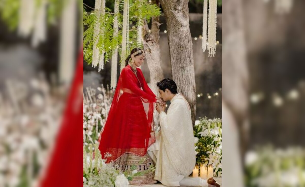 Another day, another set of pictures from Aditi Rao Hydari and Siddharth's lavish wedding in Rajasthan. On Monday, the newlyweds shared unseen gems from their D-day. Aditi looked resplendent in a red lehenga. Siddharth, on the other hand, sported a white sherwani. One of the pictures shows Siddharth kneeling and kissing his bride on her hands. Another picture shows Aditi walking down the aisle. The last snapshot shows the beautifully decorated venue.