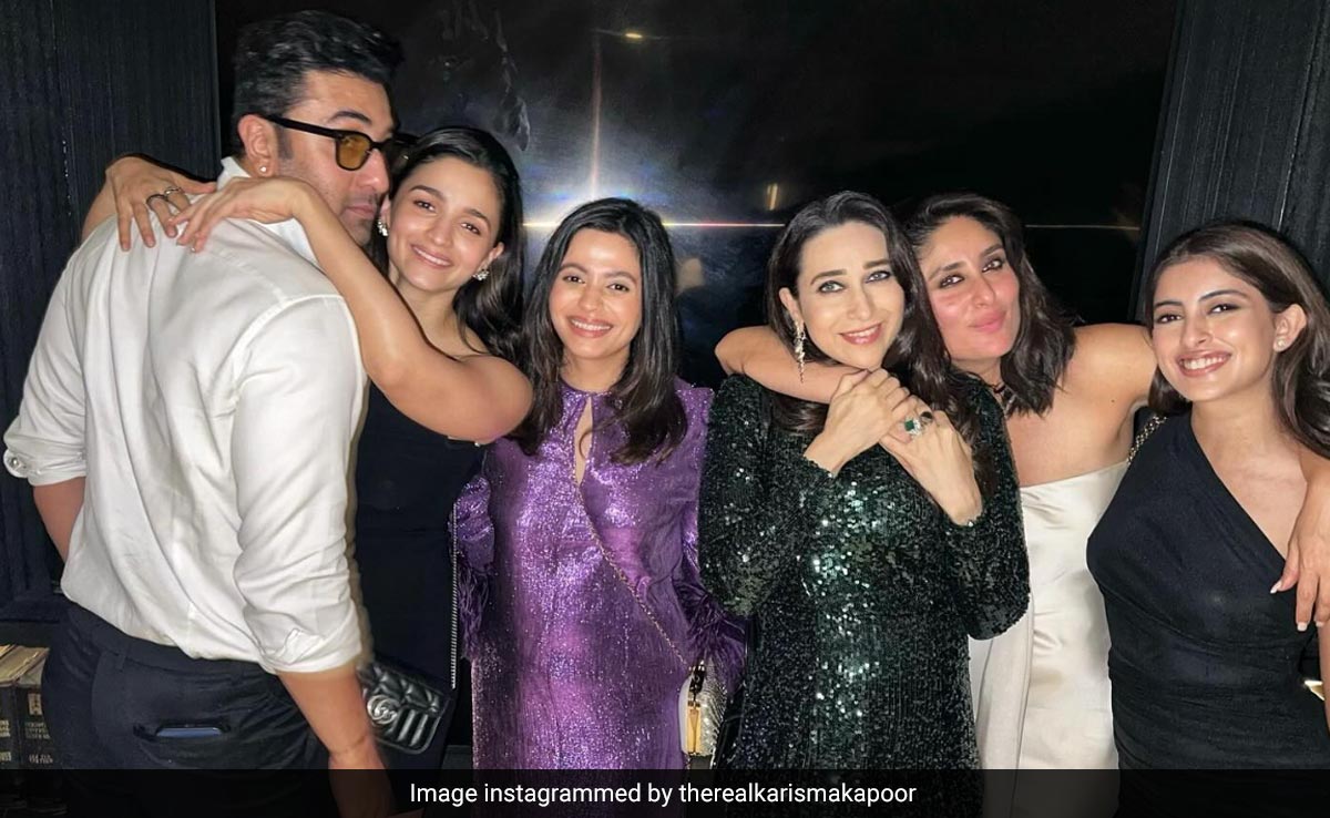 The photos from Shah Rukh Khan's 58th birthday party keep getting better and better. The superstar hosted a party for his industry friends last night and the photos from it are viral, naturally. On Friday afternoon, Karisma Kapoor shared a blockbuster photo with her family on Instagram. The photo features Alia Bhatt along with husband Ranbir Kapoor, and sister Shaheen Bhatt. Kareena and sister Karisma can be seen posing with Navya Naveli Nanda. Karisma Kapoor wrote, "Making memories with our friends and family," adding the hashtags #famjam and #foreverfriends to the post.