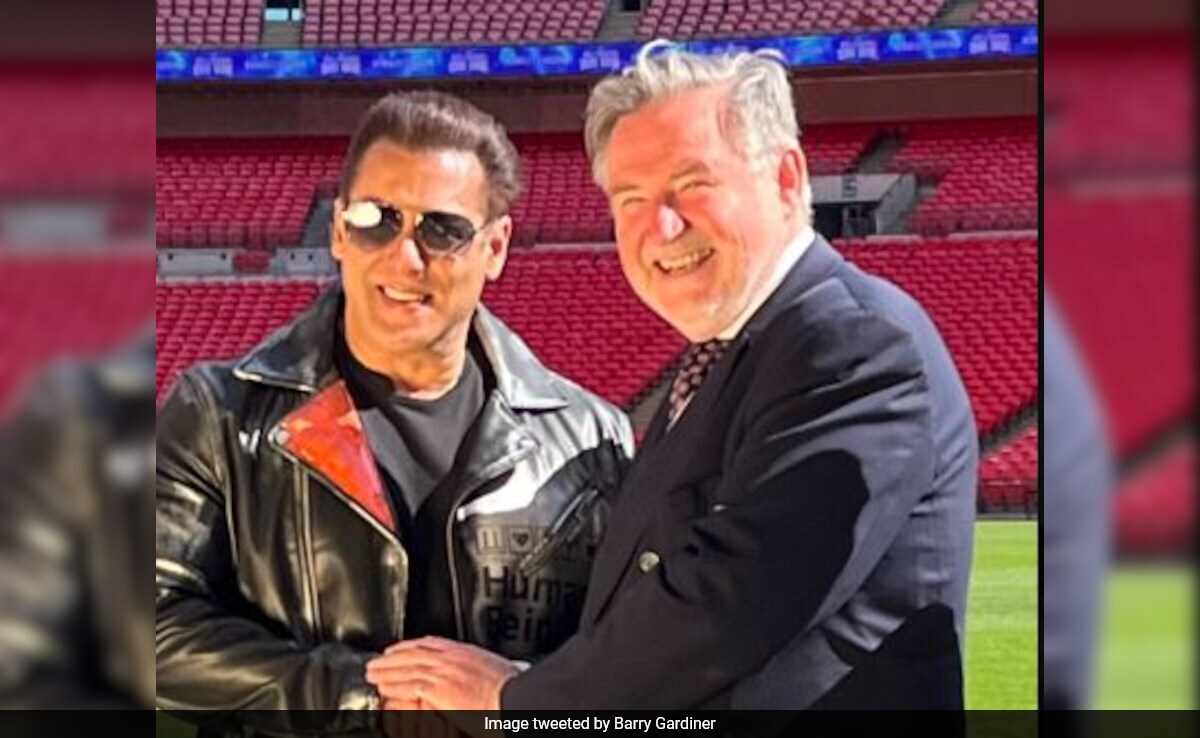 Amid security threat, Salman Khan travelled to London. UK MP from Brent North constituency Barry Gardiner shared photos with Salman Khan on X (formerly Twitter). The pictures were clicked at Wembley Stadium. Salman Khan wore a black t-shirt, jacket, jeans, dark sunglasses and black shoes. In the pictures, Salman Khan and Barry Gardiner can be seen chatting and sharing a laugh. Sharing the photos on social media, Barry wrote, "Tiger is Alive and is in London. A pleasure to welcome @BeingSalmanKhan to Wembley today." Check out the photos below:
