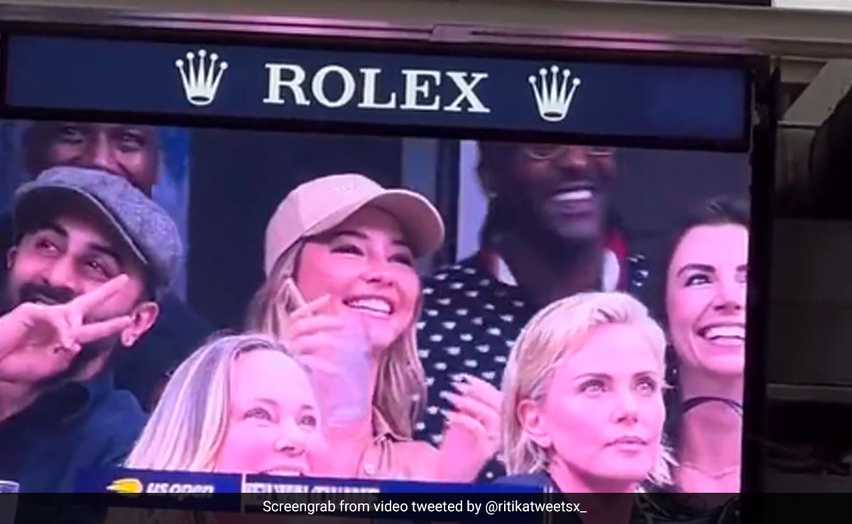Ranbir Kapoor and Alia Bhatt are spending quality time in New York. How do we know, you ask? Several pictures and videos of the couple posing with fans have surfaced on the Internet. Ranbir and Alia also attended the US Open final over the weekend. Now, a video of Ranbir photobombing actress Madelyn Cline has cropped up on social media. The clip opens to the giant screen at the games. It features actress Madelyn Cline. A few seconds later, we can see Ranbir quickly leaning towards her and showing the peace sign. A fan page, dedicated to Ranbir, shared the video on X (formerly Twitter). The text attached to it read: “Ranbir Kapoor photobombing Madelyn Cline at the US Open 2023 was not on my 2023 bucket list.”