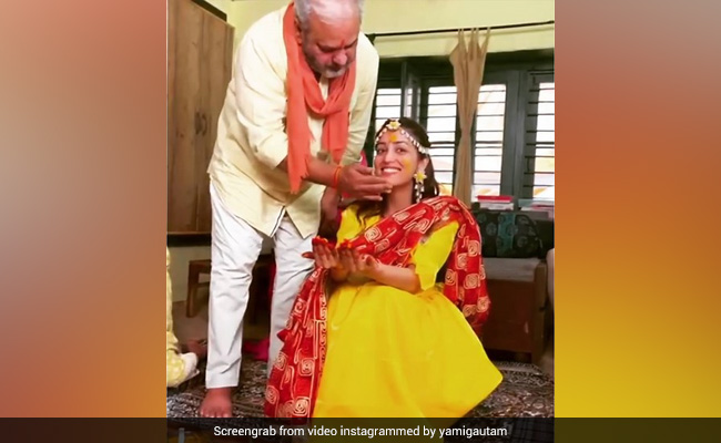 Newlywed Yami Gautam is glowing in the warmth of marital bliss. The actress married Bollywood director Aditya Dhar on June 4. The news of the wedding, held in Yami Gautam's hometown in Himachal Pradesh, came as a pleasant surprise to fans of the artists. Since the wedding, Yami has been sharing photos and videos of the low-key affair on Instagram. Now, on the occasion of her father's birthday, the actress has shared a heart-warming video from the haldi ceremony. The pre-wedding ritual saw the actress being pampered by her family and this time around, Yami Gautam's camera-shy father, director Mukesh Gautam made an appearance.