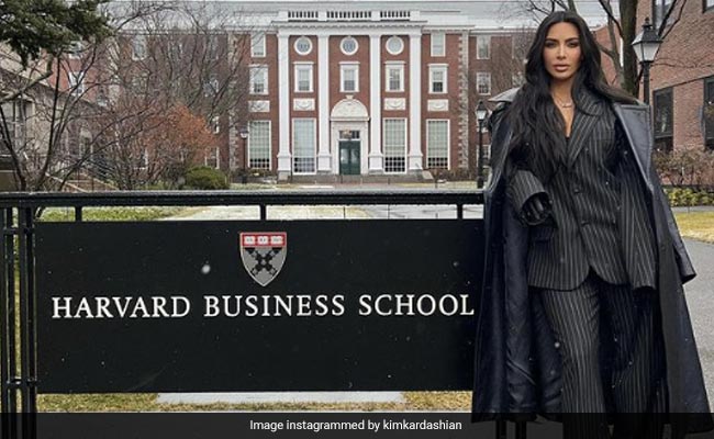Kim Kardashian on Friday visited Harvard Business School in Boston and gave a guest lecture to students about her shapewear company SKIMS. Taking to Instagram, Ms Kardashian shared a series of photos and videos of herself on campus and even included a picture of herself with students. She wore a black pin-striped suit and a long, black leather coat.