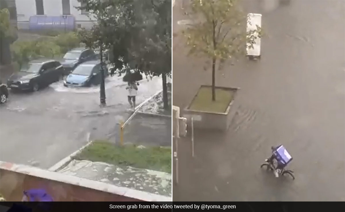A torrential downpour in Moscow has caused flash flooding, leaving residents running for cover on the streets and trapping people in cars and buses.