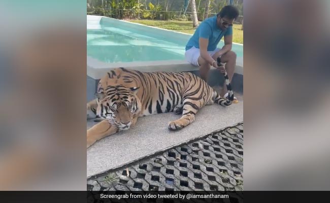 In the video, Santhanam is seen grabbing the tiger's tail and petting it. The clip further shows an official poking the animal in the head with a stick to wake it up. The tiger meanwhile looks visibly tired.