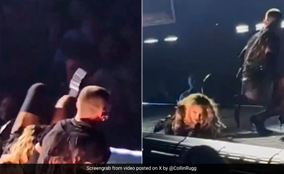 Pop icon Madonna recently experienced a minor mishap when she fell off her chair during her Celebration tour performance at Seattle's Climate Pledge Arena. The incident happened on Sunday when the pop star was performing her song 'Open Your Heart' while seated in a chair onstage. After beginning to sing the song, one of Madonna's backup dancers began to drag the chair.