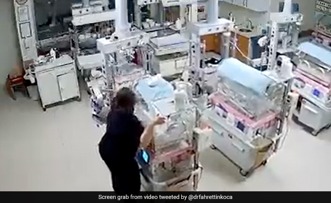 The video was shared by Turkish Health Minister Dr Fahrettin Koca on Twitter. The video shows two nurses rushing to hold onto incubators to prevent them from tipping over or sliding during the devastating earthquake.
