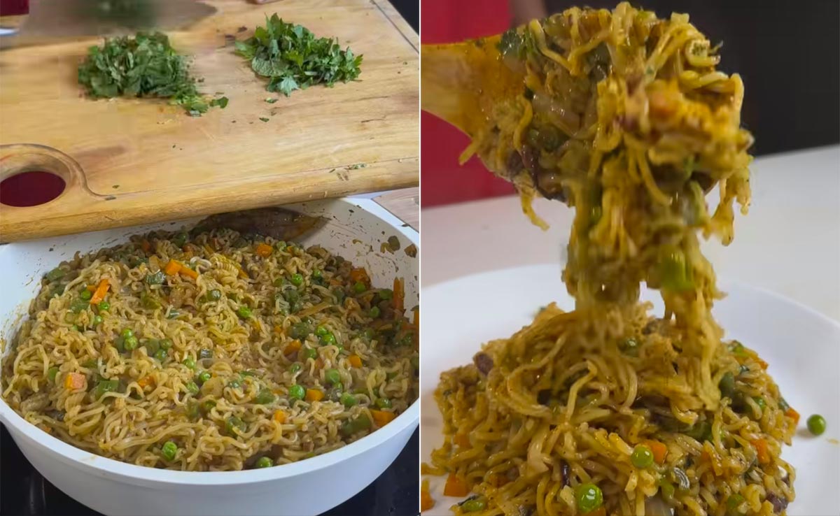 In the video, we first see the vlogger chop onions and fry them to make the classic biryani garnish. Later, he chops carrots, French beans, onions, green chillies, coriander leaves and mint leaves. Next, in a pan, he adds oil, garlic, cumin seeds and bay leaves. He adds some spice masalas, followed by the chopped veggies along with green peas. He then adds the Maggi noodles and tops them with biryani masala. He mixes all the ingredients thoroughly and pours some water over the pan. He covers it and allows the noodles to cook. Later, he garnishes the dish, transfers it to a plate and tries it. Watch the complete reel below: