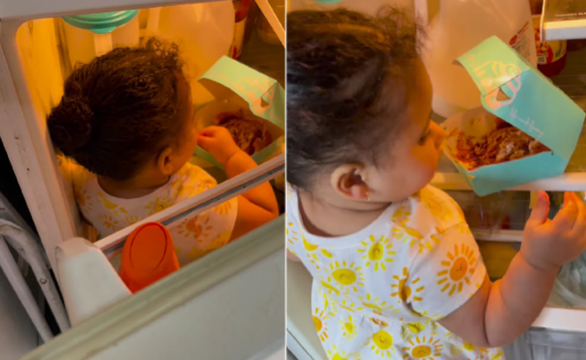 Raiding the refrigerator for a little snack late at night is something we just can't resist. Well, it seems age is no barrier when it comes to hunting for a yummy treat in the refrigerator. A recent video, shared by an Instagram user @maserati_maine, shows a baby girl standing on a shelf of a half-open fridge and secretly gorging on a cinnamon bun. She was caught red-handed, but she had a plan. The kid stood there like a statue avoiding any eye contact and didn't even respond to a tap on her arm. The clip was shared along with the text, "Nah these new kids are BAD and then she's gonna just stand there like if I don't move you can't see me."