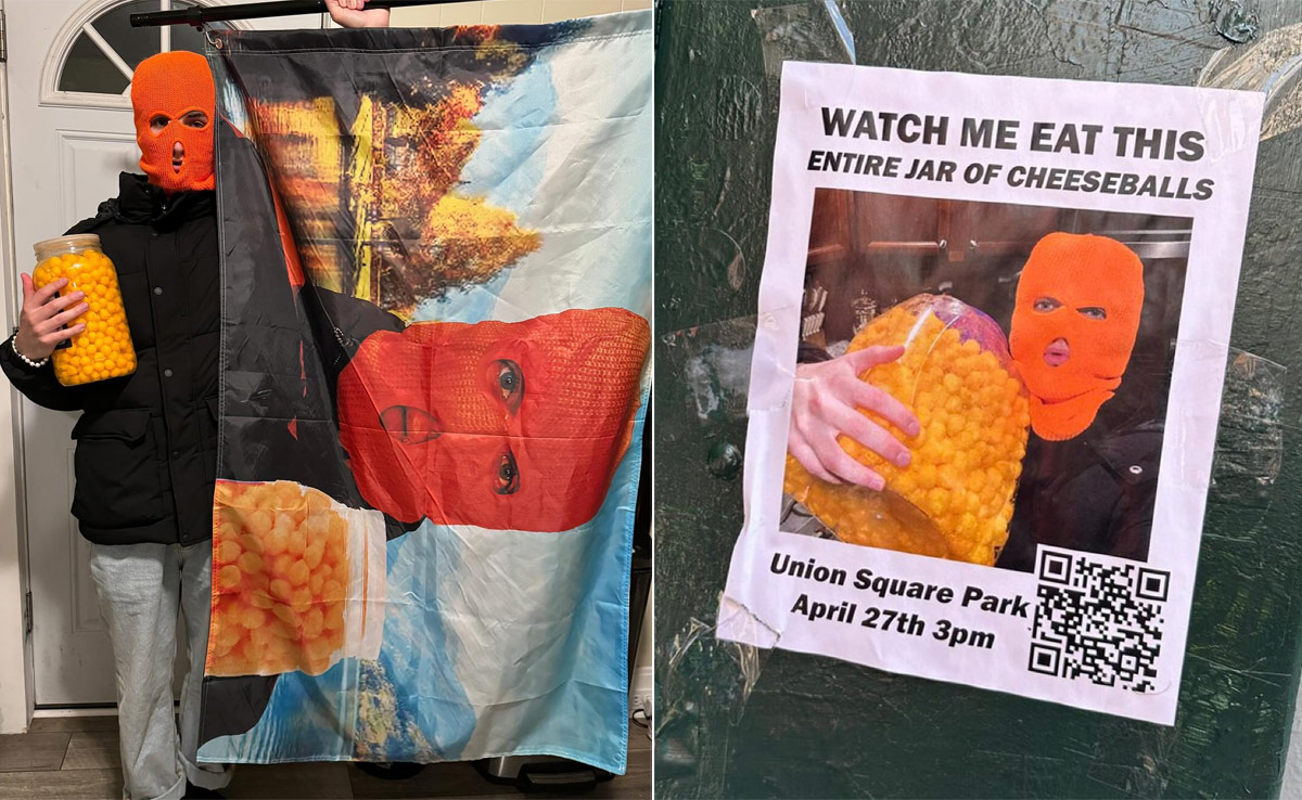 The poster features a QR code and a photo of the man, with a neon orange mask (that completely hides his face) and a short cape, holding a jar of cheeseballs. The text reads, "Come watch me eat this entire jar of cheeseballs. Union Square Park April 27th at 3 pm." Hundreds of curious onlookers gathered in the Park to see what would happen. Several captured videos and photos of the cheeseball man's actions. They have since gone viral on multiple platforms, sparking a range of reactions online.