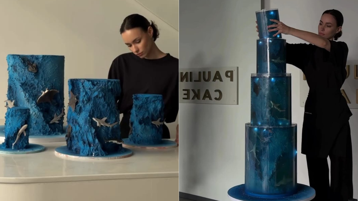 A reel showing a pastry chef crafting a 4-tiered cake inspired by a marine theme park has clocked millions of views on social media. The level of creativity and detail has left users in awe, and many have called it a true artistic masterpiece. The video shared by @pauline_cake starts with the chef crafting small edible sculptures of various marine animals, like sharks, stingrays, etc. She carefully shapes the dough/fondant to form the body of these creatures and adds intricate details along with their fins, tails, etc. She spray-paints them in shades of grey. We also get a glimpse of a table filled with many such creations, which the chef had already kept ready.