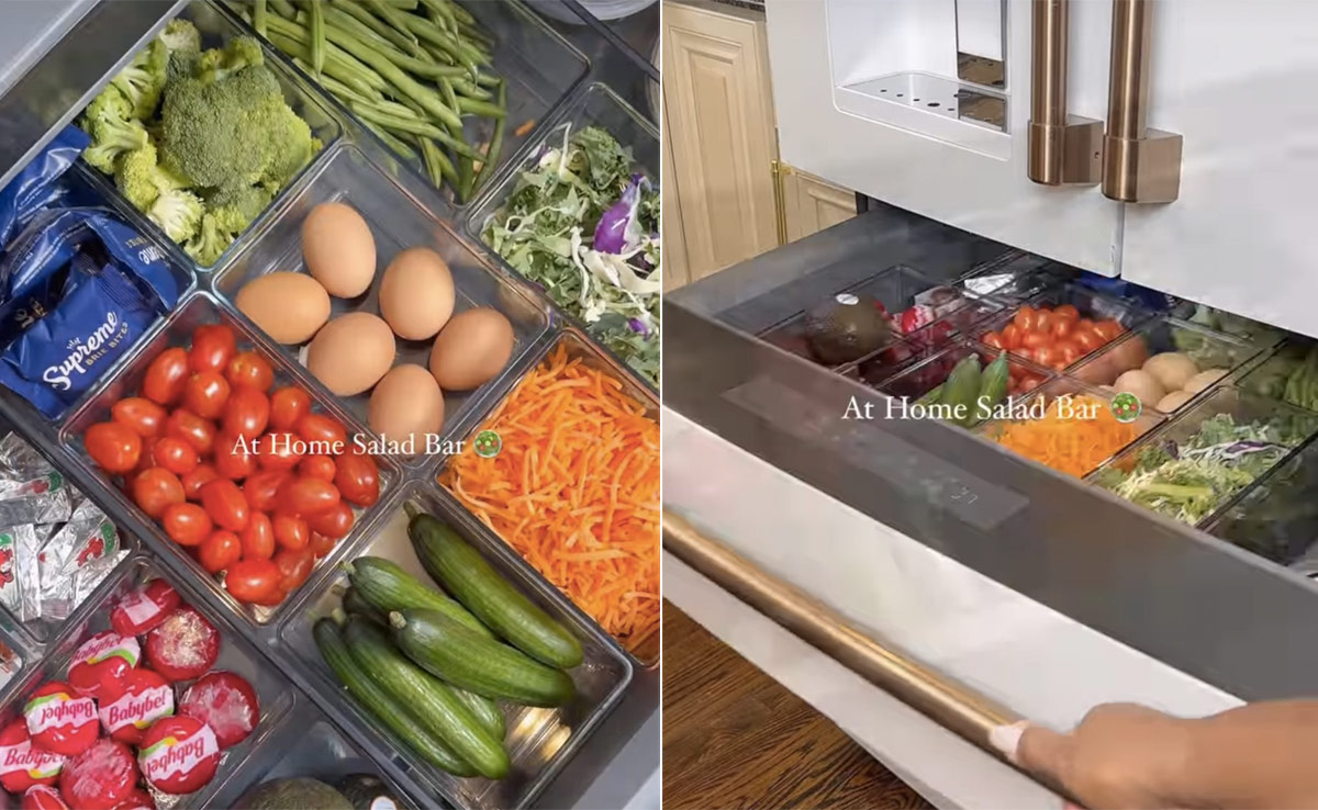 In the video, the content creator gives us a brief glimpse at her salad set-up. All the ingredients are arranged in individual containers, which are neatly fitted inside a large fridge drawer. Thus, all she has to do is pull out the drawer and start picking the ingredients of her salad. In the reel, we can see eggs, several veggies (whole and chopped), cheese, salad dressing options and more. In the caption, the content creator wrote, "One of my New Year's resolutions is to eat at least one salad per day, and this system has really helped. Even my husband has taken to eating more salads as well."