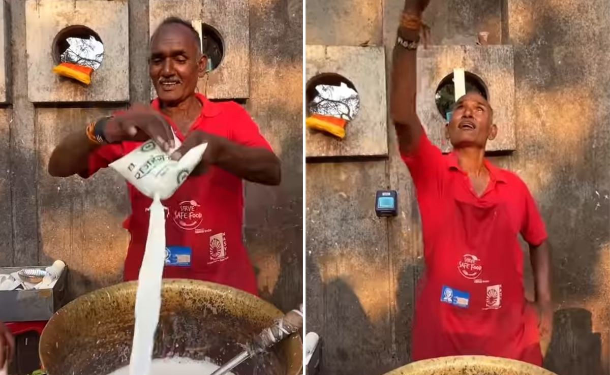 An Instagram reel by @foodie_.life features "Surat's famous action chaiwala". In the video, we see a roadside tea vendor tossing milk packets high in the air before emptying them in a vessel with water. He adds chopped greens, tea leaves, sugar and other ingredients to make the beverage. He pours the mixture into another vessel covered with a cloth in order to strain it. He allows the chai to come to a boil and then it is ready. Watch the complete viral video below.