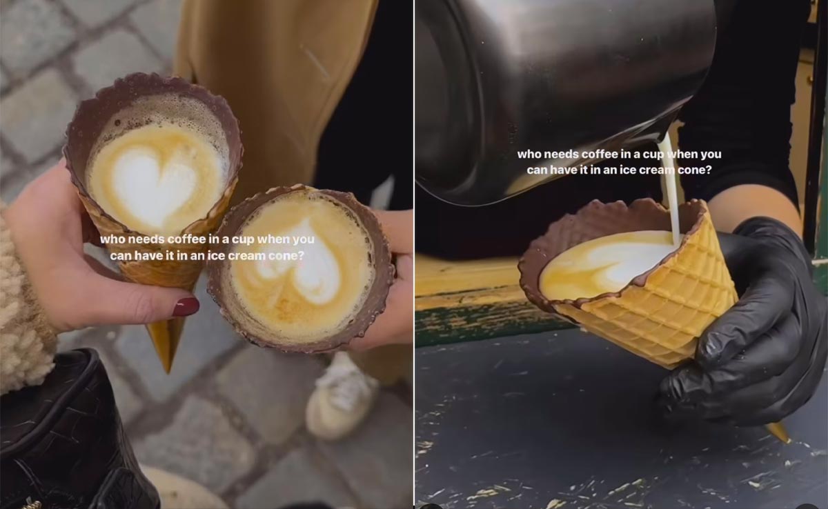 As per the caption, this unique drink can be found at a cafe in Vienna. The text on the clip reads, "Who needs coffee in a cup when you can have it in an ice cream cone?" Take a look at the video here.