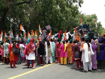 In Delhi today, Congress workers demonstrated at the BJP's headquarters against Nihalchand, demanding that the PM explain why he delivers speeches on the safety of women but has refused to penalize a member of his government who is tainted by allegations of rape. "This is the real face of the Modi government, all their claims sound hollow," said Shobha Oza of the Congress.