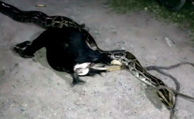 A 20-foot long python was 'rescued' by villagers and a forest official in West Bengal's Jalpaiguri district after it killed and tried to swallow a goat on Thursday. It was released into the forest later.