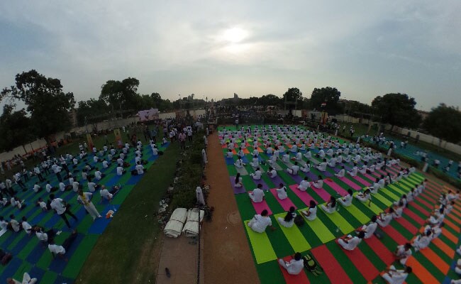 Kick-starting the events around the 2nd International Yoga Day, yoga guru Ramdev on Sunday led a gathering of over 30,000 in a grandiose Yog Mahotsav, filling Delhi's Rajpath with yoga mats.The spectacular view was captured in 360 degrees. Move these pictures around to get different perspectives.