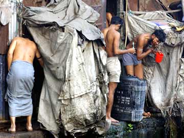 File photo: In this picture taken on 17 January 2004, Indian youths clean their teeth near an open sewer in the slum of Dharavi in Mumbai.