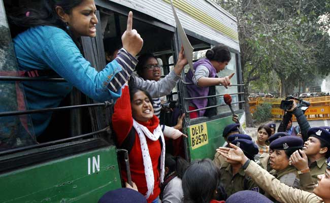 Over 100 students from JNU were detained today for protesting against education ministry for what the termed as 'delay in justice' to Dalit scholar Rohith Vemula . (PTI photo)