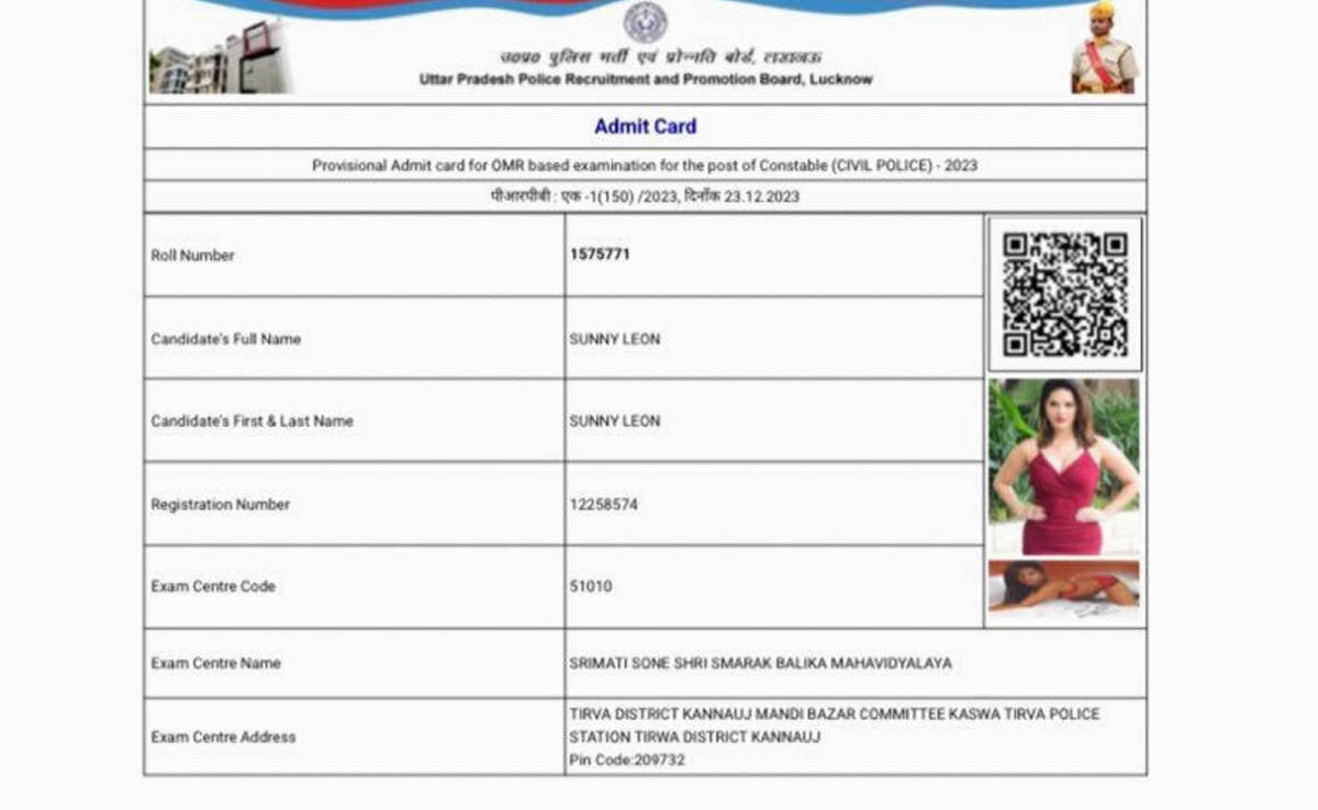 In a bizarre situation, actor Sunny Leone's photo was seen on an admit card for the Uttar Pradesh Police Constable Recruitment exam.