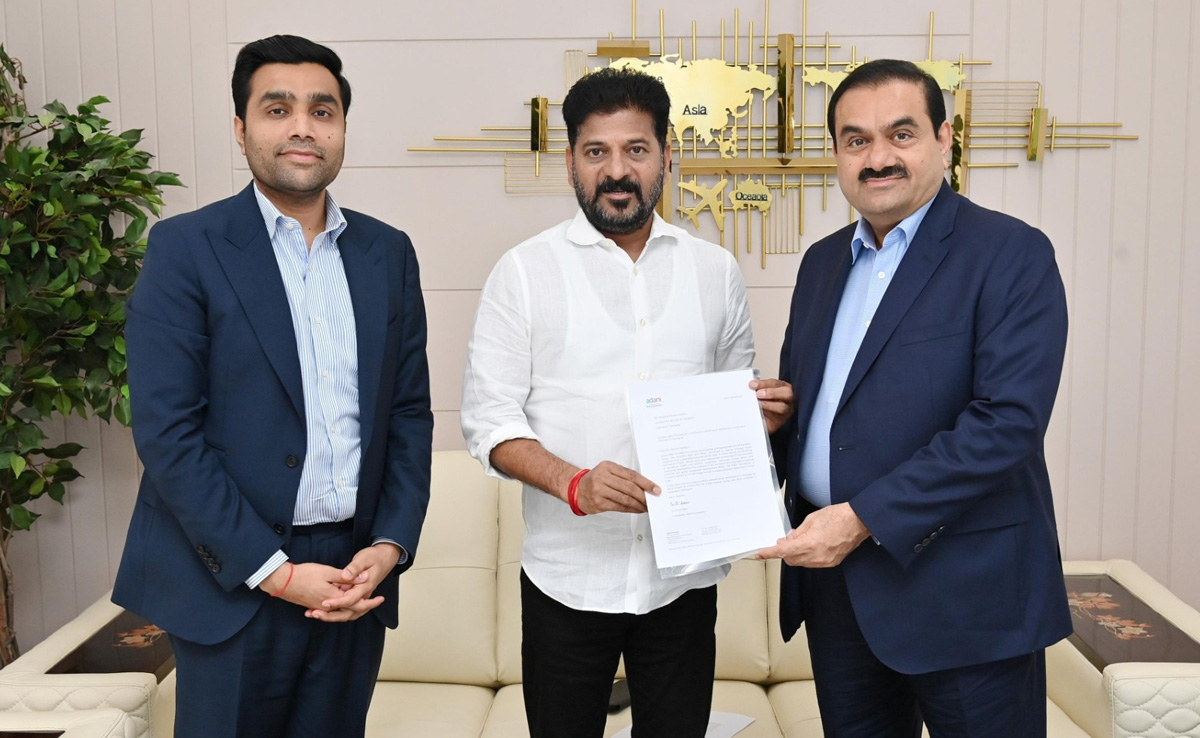 A delegation led by Adani Group Chairman Gautam Adani met Telangana Chief Minister Revanth Reddy in Hyderabad on Friday and handed over the cheque to him.