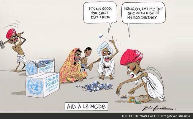 The cartoon shows an emaciated Indian family breaking solar panels and one person trying to eat them with 'mango chutney'.