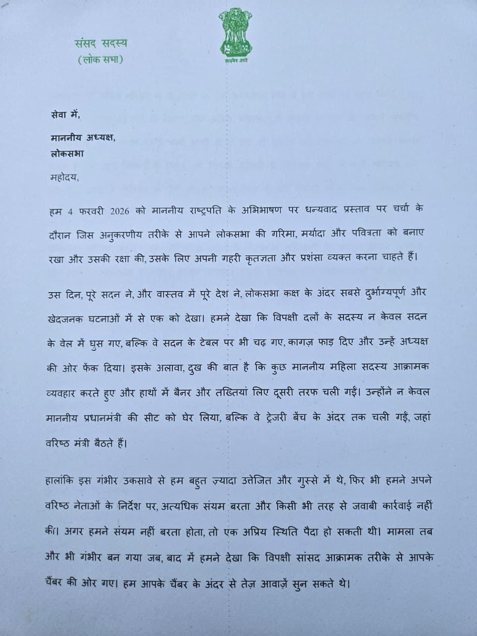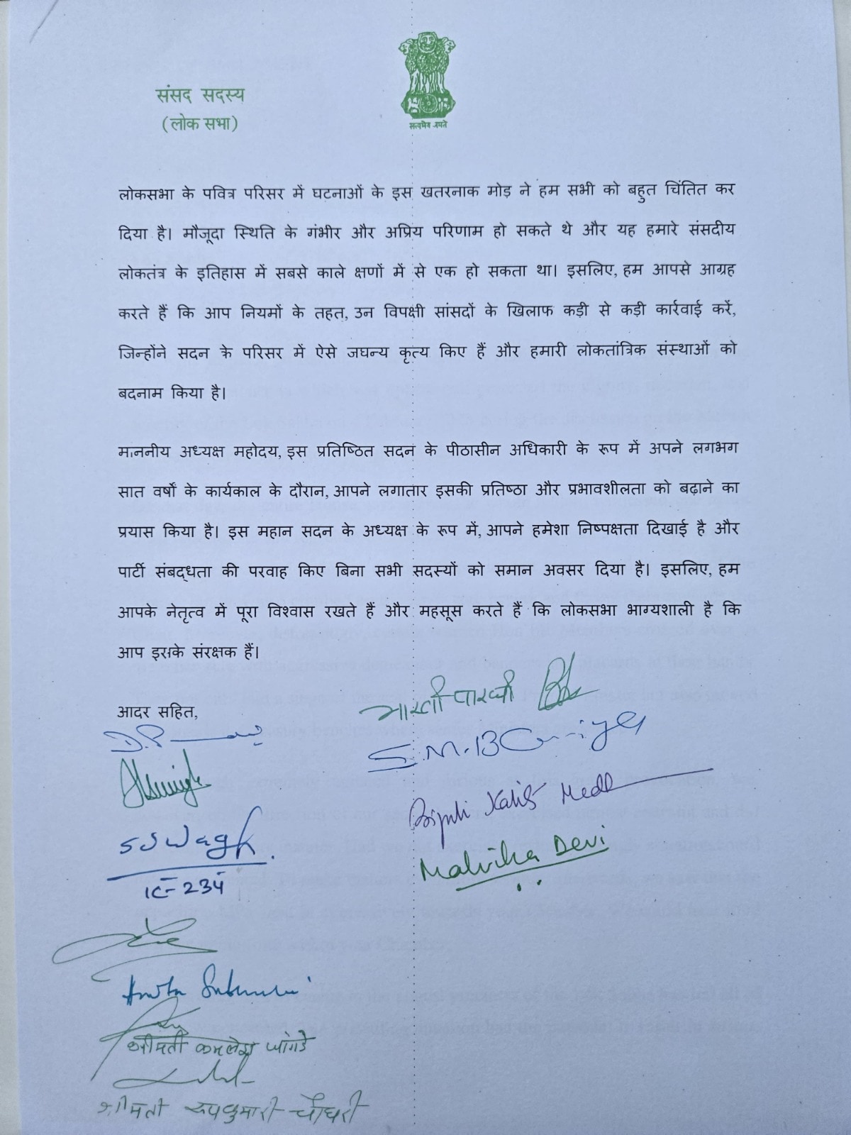 In their letter the BJP MPs praised Birla's role, claiming he "displayed patience and perseverance to uphold the dignity of (the) Lok Sabha" in the face of "unfortunate and regrettable" events.
