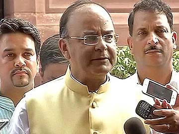 Union Finance Minister Arun Jaitley speaks to reporters outside Parliament