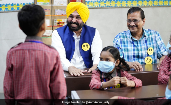 Delhi Chief Minister Arvind Kejriwal and his deputy Manish Sisodia accompanied Mr Mann to a Delhi government school in Chirag Enclave.