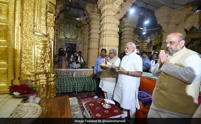 As Varanasi, Prime Minister Narendra Modi's parliamentary constituency in Uttar Pradesh reported brisk voting on Wednesday morning, PM Modi was in his home state Gujarat, deep in prayer at the famous Somnath temple. With him was BJP chief Amit Shah. Both leaders are in Gujarat after a hectic campaign that saw them camped in Varanasi in a bid to secure the crucial eastern UP region for the BJP in assembly elections in the country's most populous state.