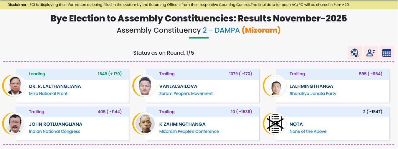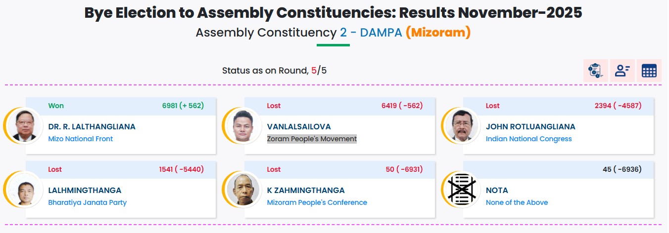 A final result has been declared in Mizoram, where the Mizo National Front (MNF) has secured a victory. Dr. R Lalthangliana of the MNF won the Dampa bypoll by a margin of 562 votes. He beat his rivals, including candidates from the Zoram People's Movement (ZPM), Congress, and the BJP.