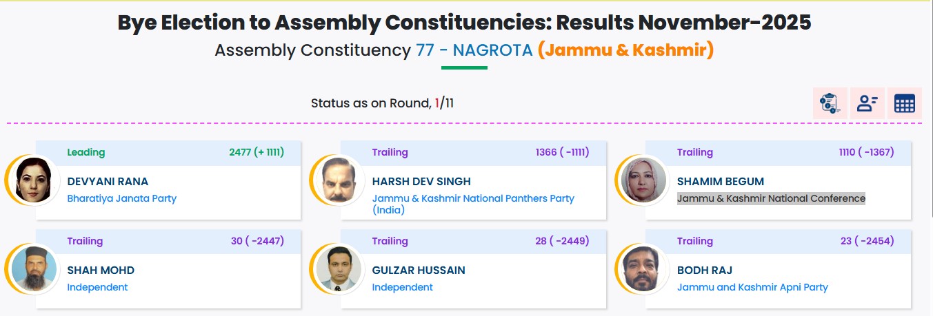 BJP's candidate, Devyani Rana, is currently leading the contest with a significant margin of 1,111 votes. She has established a lead over her main competitors, Harsh Dev Singh of the Jammu & Kashmir National Panthers Party and Shamim Begum of the Jammu & Kashmir National Conference, who are trailing in the initial count.